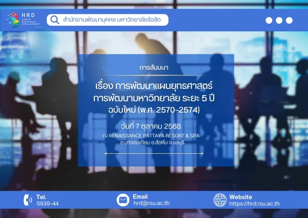 แผนยุทธศาสตร์มหาวิทยาลัย มหาวิทยาลัยรังสิต กำหนดจัดงานสัมมนาผู้บริหารระดับสูง ในหัวข้อเรื่อง “การพัฒนาแผนยุทธศาสตร์การพัฒนามหาวิทยาลัย ระยะ 5 ปี ฉบับใหม่ (พ.ศ.2570-2574) ” ในวันที่...