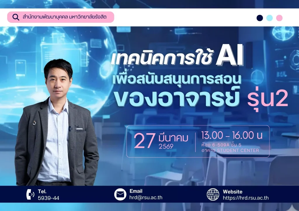 ด่วน !! รับจำนวนจำกัด 40 ท่านเท่านั้น สำนักงานพัฒนาบุคคล ขอเชิญบุคลากรที่สนใจเข้าร่วมโครงการฝึกอบรม หลักสูตร “เทคนิคการใช้ AI เพื่อสนับสนุนการสอนของอาจารย์” รุ่น 2 วันศุกร์ที่ 27 กุมภาพันธ์ 2569 ณ ห้องปฏิบัติการคอมพิวเตอร์ 6-509A ชั้น 5 อาคาร Student Center รุ่น 2 – 27 มีนาคม 69 เวลา 13.00-16.00 น. หัวข้อการอบรม ศิลปะการสั่งงานให้ได้ผลลัพธ์ที่ตรงใจ ยกระดับการออกแบบการเรียนการสอนให้น่าสนใจ สร้างสรรค์สื่อการเรียนรู้คุณภาพสูง ในเวลาที่รวดเร็ว การวัดและประเมินผลที่ตอบโจทย์ผู้เรียน กลุ่มเป้าหมาย – อาจารย์ประจำ จำนวน 40 ท่าน !! หมดเขตรับสมัคร 16 มีนาคม 2569 หรือจนกว่า.. มีผู้สมัครครบตามจำนวน! หน้าข่าวประชาสัมพันธ์ #อย่าหยุดยั้งการพัฒนาตัวเอง#HRDRSU