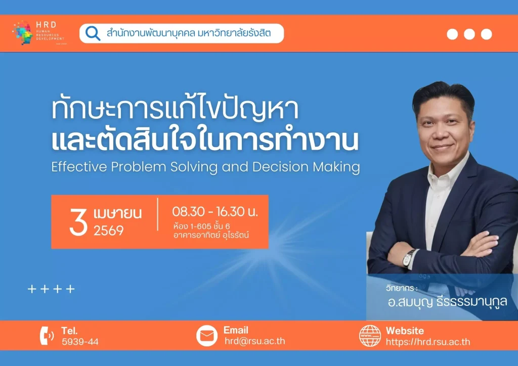 มหาวิทยาลัยรังสิต กำหนดจัดโครงการพัฒนาผู้บริหาร หลักสูตร “การบริการเหนือความคาดหมาย” ให้กับบุคลากรสายสนับสนุน ในวันที่ 23 เมษายน 2569 เวลา 08.30-16.30 น. ณ ห้อง 1-301 ชั้น 3 อาคารอาทิตย์ อุไรรัตน์ ได้รับเกียรติจาก อ.เต็ด วิทยากรสาระบันเทิง เป็นวิทยากรบรรยาย 23 เม.ย.69 เวลา 08.30-16.30 น. เงื่อนไขการฝึกอบรม : ผู้เข้าอบรมต้องเข้าร่วมฝึกอบรมได้ตลอดหลักสูตร 6 ชม. กลุ่มเป้าหมาย บุคลากรสายสนับสนุนจำนวน 50 คน ส่งแบบตอบรับได้ที่ … สำนักงานพัฒนาบุคคล (HRD) โทรสาร 5942 หรือ E-Mail : hrd@rsu.ac.th หน้าข่าวประชาสัมพันธ์ #อย่าหยุดยั้งการพัฒนาตัวเอง#HRDRSU