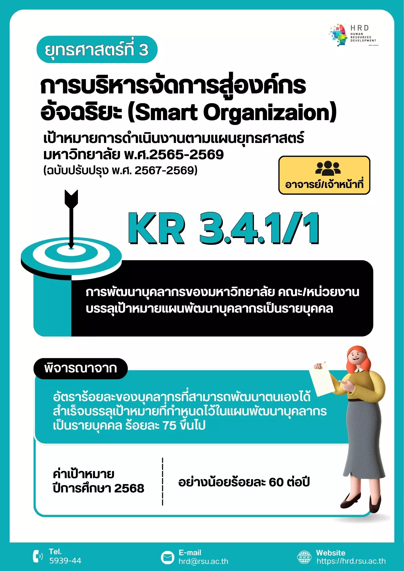 - พิจารณาจาก : อัตราร้อยละของบุคลากรที่สามารถพัฒนาตนเองได้สำเร็จบรรลุเป้าหมายที่กำหนดไว้ในแผนพัฒนาบุคลากรเป็นรายบุคคล ร้อยละ 75 ขึ้นไป