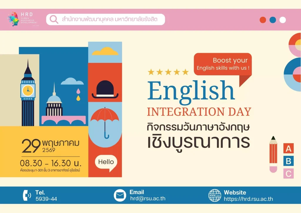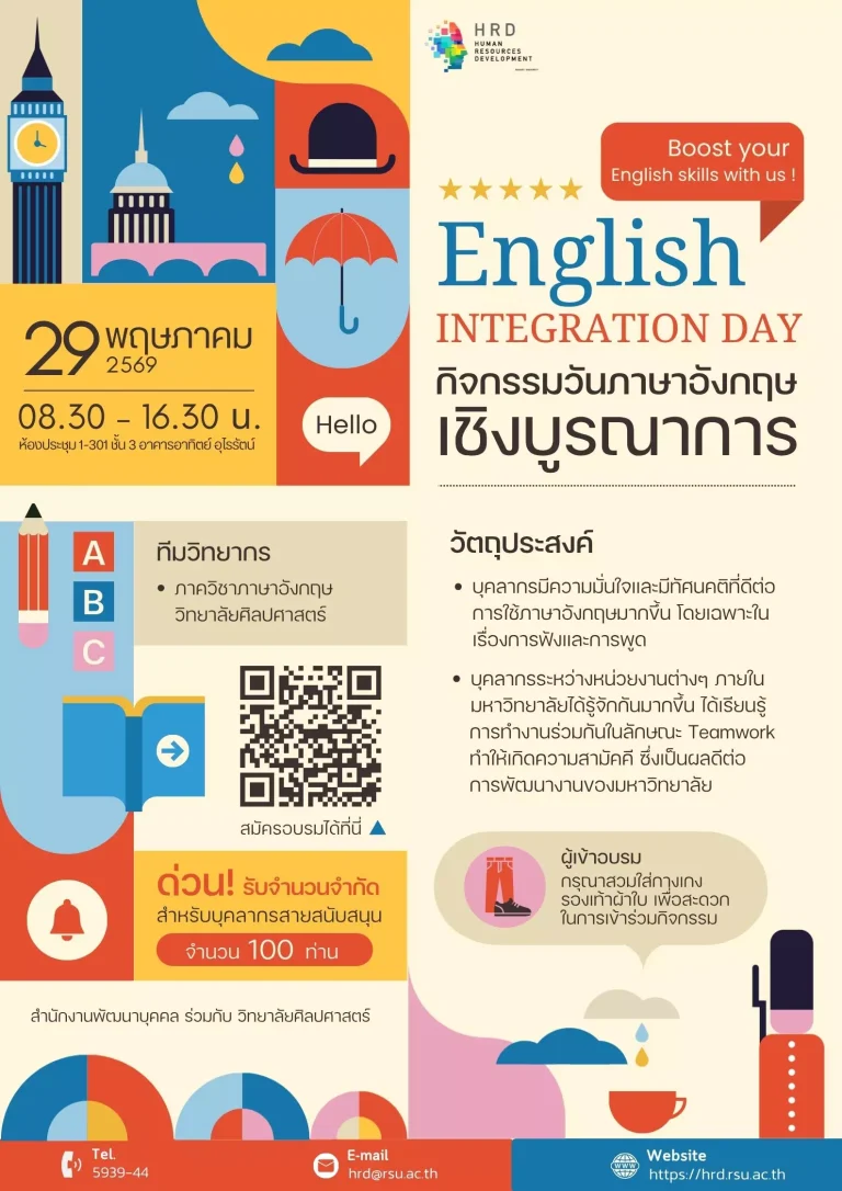 English Integration Day-68 / ข่าวอบรม / By apear Boost your English skills with us ! วิทยาลัยศิลปศาสตร์ ร่วมกับ สำนักงานพัฒนาบุคคล กำหนดจัดโครงการฝึกอบรม หลักสูตร “กิจกรรมวันภาษาอังกฤษเชิงบูรณาการ” English Integration Day ในวันศุกร์ที่ 29 พฤษภาคม 2569 เวลา 08.30-16.30 น. ณ ห้องประชุม 1-301 ชั้น 3 อาคารอาทิตย์ อุไรรัตน์ 29 พฤษภาคม 2569 เวลา 08.30-16.30 น. +++ รับสมัครเข้าร่วมอบรม จำนวน 100 คน +++ * ผู้เข้าอบรม-กรุณาสวมใส่ กางเกงและรองเท้าผ้าใบ เพื่อสะดวกในการทำกิจกรรม * หมดเขตรับสมัคร 12 พฤษภาคม 2569 สามารถสอบถามรายละเอียดเพิ่มเติมได้ที่… สำนักงานพัฒนาบุคคล โทร. 5940 หน้าข่าวประชาสัมพันธ์ “the never ending chance to improve not only yourself,but also to attract opportunities and affect others” #อย่าหยุดยั้งการพัฒนาตนเอง