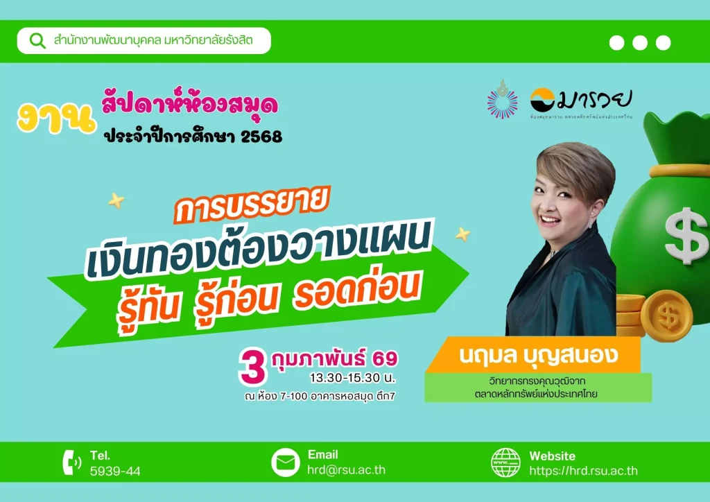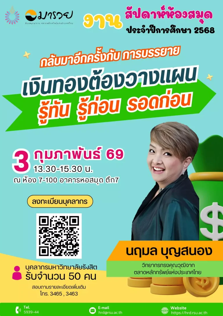 สัปดาห์ห้องสมุด2569 / rsu, ข่าวอบรม / By apear สำนักหอสมุดมหาวิทยาลัยรังสิต ขอเชิญชวนอาจารย์และบุคลากรที่สนใจเข้าร่วมงาน “สัปดาห์ห้องสมุด” ระหว่างวันที่ 3-6 กุมภาพันธ์ 2569 ณ บริเวณอาคารหอสมุด โดยในงานจะมีการบรรยายพิเศษ ซึ่งได้รับเกียรติจากวิทยากรผู้ทรงคุณวุฒิของตลาดหลักทรัพย์แห่งประเทศไทย ในหัวข้อเรื่อง “เงินทองต้องวางแผน รู้ทัน รู้ก่อน รอดก่อน” ในวันที่ 3 กุมภาพันธ์ 2569 เวลา 13.30-15.30 น. ณ ห้อง 7-100 ชั้น 1 อาคารหอสมุด เงินทองต้องวางแผน รู้ทัน รู้ก่อน รอดก่อน 3 กุมภาพันธ์ 2569 เวลา 13.30-15.30 น. ห้อง 7-100 ชั้น 1 อาคารหอสมุด รับจำนวนจำกัด 50 ท่านเท่านั้น !! หมดเขตรับสมัคร 31 มกราคม 69 สามารถสอบถามรายละเอียดเพิ่มเติมได้ที่… สำนักหอสมุด โทร. 3465, 3463 หรือ สำนักงานพัฒนาบุคคล โทร. 5940-41 หน้าข่าวประชาสัมพันธ์ #อย่าหยุดยั้งการพัฒนาตนเอง
