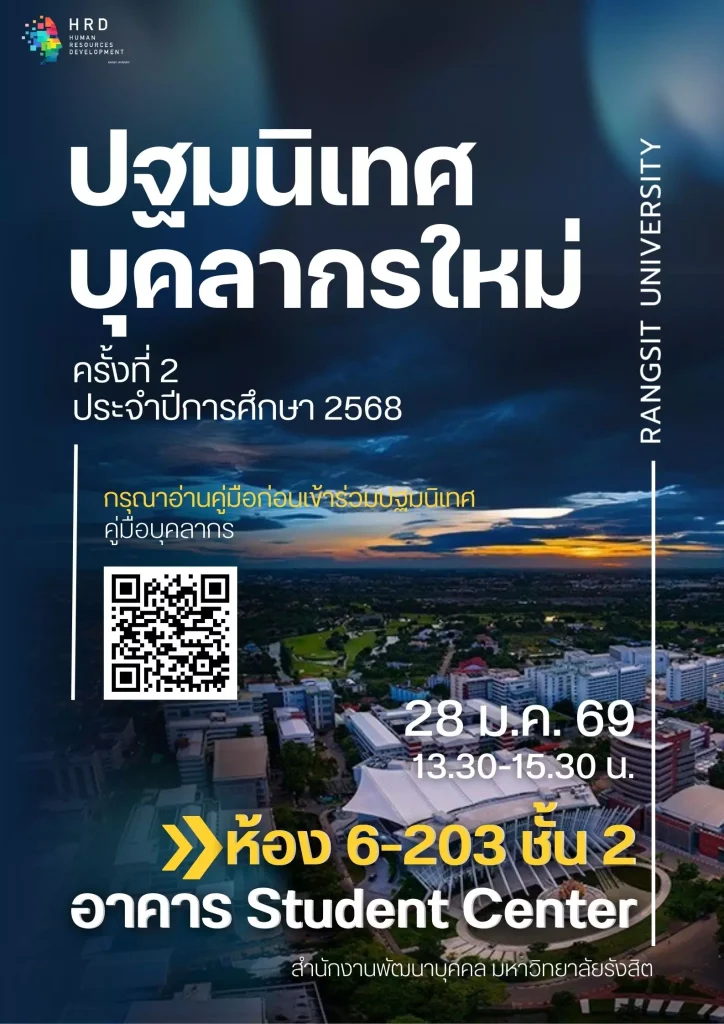 ปฐมนิเทศบุคลากรใหม่ครั้งที่ 2 / rsu, ข่าวอบรม / By apear สำนักงานบุคคล ร่วมกับ สำนักงานพัฒนาบุคคล กำหนดจัดโครงการปฐมนิเทศบุคลากรใหม่ ครั้งที่ 2 ประจำปีการศึกษา 2568 ในวันที่ 28 มกราคม 2569 เวลา 13.30 น. ห้อง 6-203 ชั้น 2 อาคาร Student Center สอบถามรายละเอียดเพิ่มเติม ได้ที่ คุณนิษฐา โทร. 02-791-5940 โทรภายใน 5940 หน้าข่าวประชาสัมพันธ์