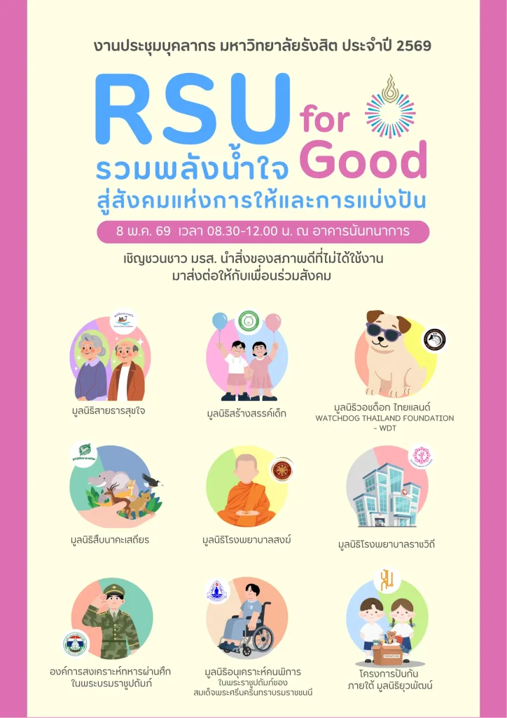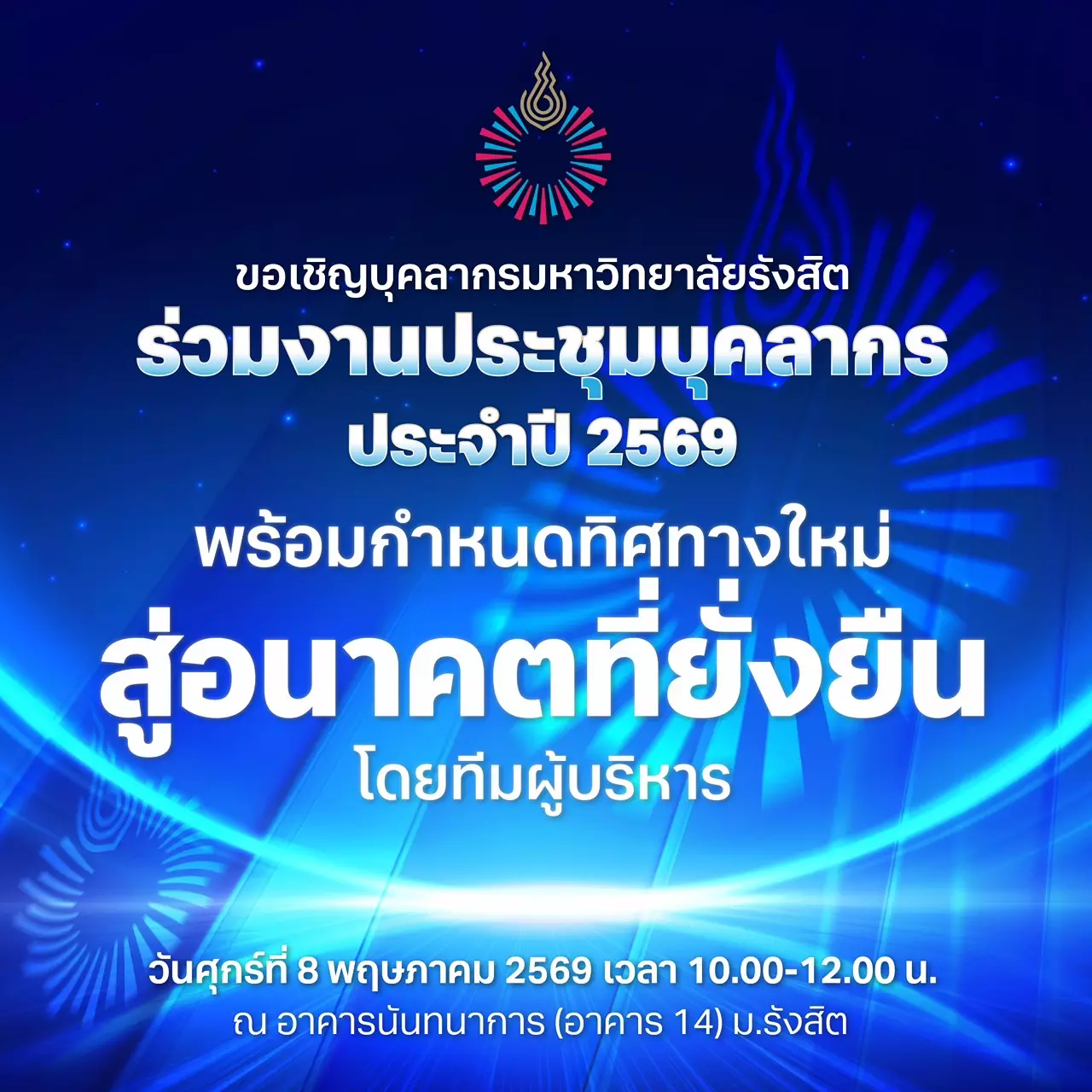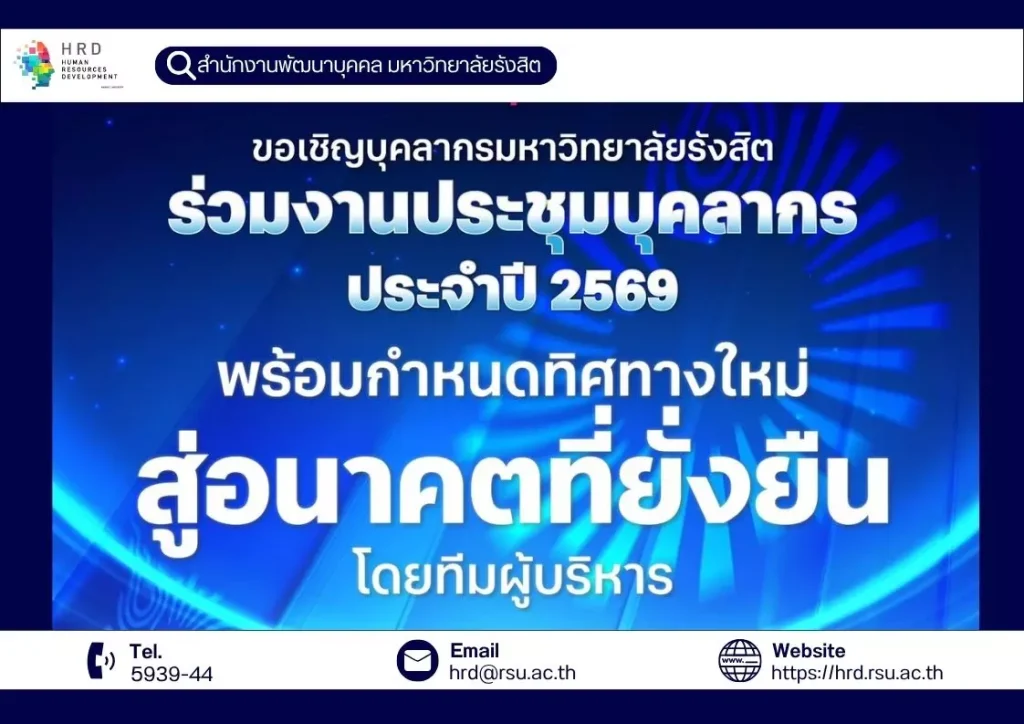 ประชุมบุคลากรประจำปี 2569 / ข่าวอบรม / By apear ขอเชิญชวนบุคลากร เข้าร่วมงานประชุมบุคลากร มหาวิทยาลัยรังสิต ประจำปี 2569 และขอเชิญชวนชาว ม.รังสิต ร่วมเป็นส่วนหนึ่งของการให้ที่ยิ่งใหญ่ ผ่านการสนับสนุน 9 องค์กร ในกิจกรรม “รวมพลังน้ำใจ สู่สังคมแห่งการให้และการแบ่งปัน – RSU for Good “ ในวันที่ 8 พฤษภาคม 2569 เวลา 08.30-12.00 น. ณ อาคารนันทนาการ ทิศทางใหม่ สู่อนาคตที่ยั่งยืน 8 พฤษภาคม 2569 เวลา 08.30-12.00 น. RSU for GOOD รวมพลังน้ำใจ สู่สังคมแห่งการให้และการแบ่งปัน หน้าข่าวประชาสัมพันธ์