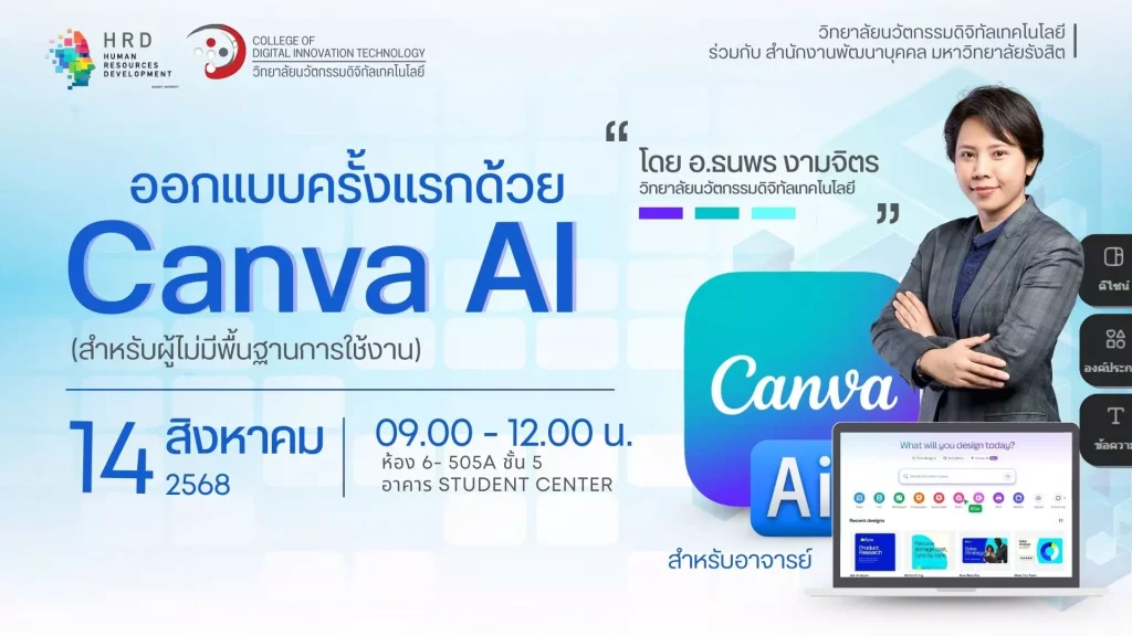 สรุปข้อมูลผู้ได้รับการพัฒนา ประจำปีการศึกษา 2568 เฉพาะโครงการที่จัดโดยสำนักงานพัฒนาบุคคล เท่านั้น ( 1 มิถุนายน 2568 - 31 พฤษภาคม 2569) ท่านสามารถกดดูรายชื่อได้ที่ >> ชื่อแต่ละโครงการ 1.โครงการ ออกแบบครั้งแรกด้วย Canva AI วันที่ 14 และ 15 สิงหาคม 2568 เวลา 09.00-12.00 น. ณ ห้อง 6-505 ชั้น 5 อาคาร Student Centerรายชื่อผู้เข้าอบรม (อาจารย์) CLICK HEREรายชื่อผู้เข้าอบรม (เจ้าหน้าที่) CLICK HEREวิทยากร อ.ธนพร งามจิตร สาขาวิชานวัตกรรมดิจิทัล วิทยาลัยนวัตกรรมดิจิทัลเทคโนโลยีสรุปรูปภาพการอบรม https://hrd.rsu.ac.th/portfolio/canva-ai/ 2.โครงการ ปฏิรูปการศึกษาไทย โอกาสและความท้าทาย วันที่ 29 สิงหาคม 2568 เวลา 09.00-12.00 น. ณ ห้อง 1-301 ชั้น 3 อาคารอาทิตย์ อุไรรัตน์รายชื่อผู้เข้าอบรม CLICK HEREวิทยากร ศ.ดร.เกรียงศักดิ์ เจริญวงศ์ศักดิ์ ศ.ดร.สุชัชวีร์ สุวรรณสวัสดิ์ และ ศ.ดร.เอนก เหล่าธรรมทัศน์ คลิปการประชุม https://youtu.be/3nq3jAWbR24 3.โครงการ การพัฒนามหาวิทยาลัยด้วยแนวปฏิบัติที่ดี วันที่ 19 กันยายน 2568 เวลา 13.00-15.30 น. ณ ห้อง 6-200 ชั้น 2 อาคาร Student Centerรายชื่อผู้เข้าอบรม CLICK HEREวิทยากร – ประธานคณะอนุกรรมการการจัดการความรู้ 5 ประเด็นยุทธศาตร์– ผศ.ดร.วุฒิพงษ์ ชินศรี– ผศ.สมศักดิ์ เอื้ออัชฌาสัย– ดร.สมิตา กลิ่นพงศ์ คลิปการประชุม https://rkms.rsu.ac.th/km68/ 4.โครงการ ปฐมนิเทศบุคลากรใหม่ ครั้งที่1/2568 วันที่ 26 กันยายน 2568 เวลา 13.00-15.00 น. ณ ห้อง 1-702 ชั้น 7 อาคารอาทิตย์ อุไรรัตน์ รายชื่อผู้เข้าอบรม CLICK HEREวิทยากร – ดร.สมิตา กลิ่นพงศ์– คุณสมญา แชมเบอร์ส รูปภาพการอบรม https://hrd.rsu.ac.th/portfolio/ori168/ .. ..