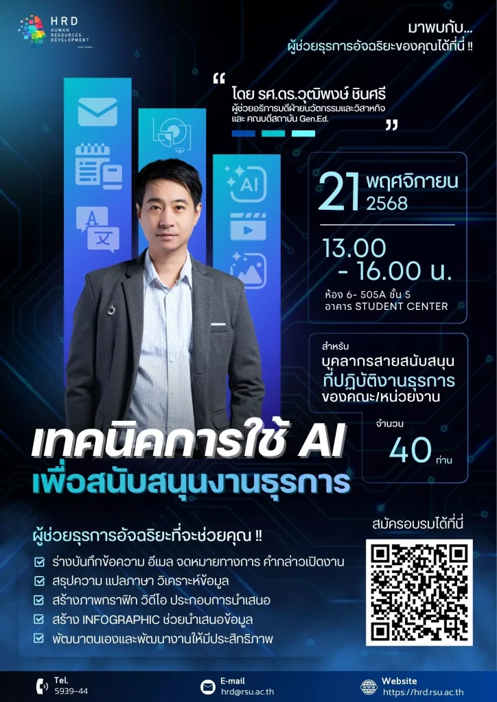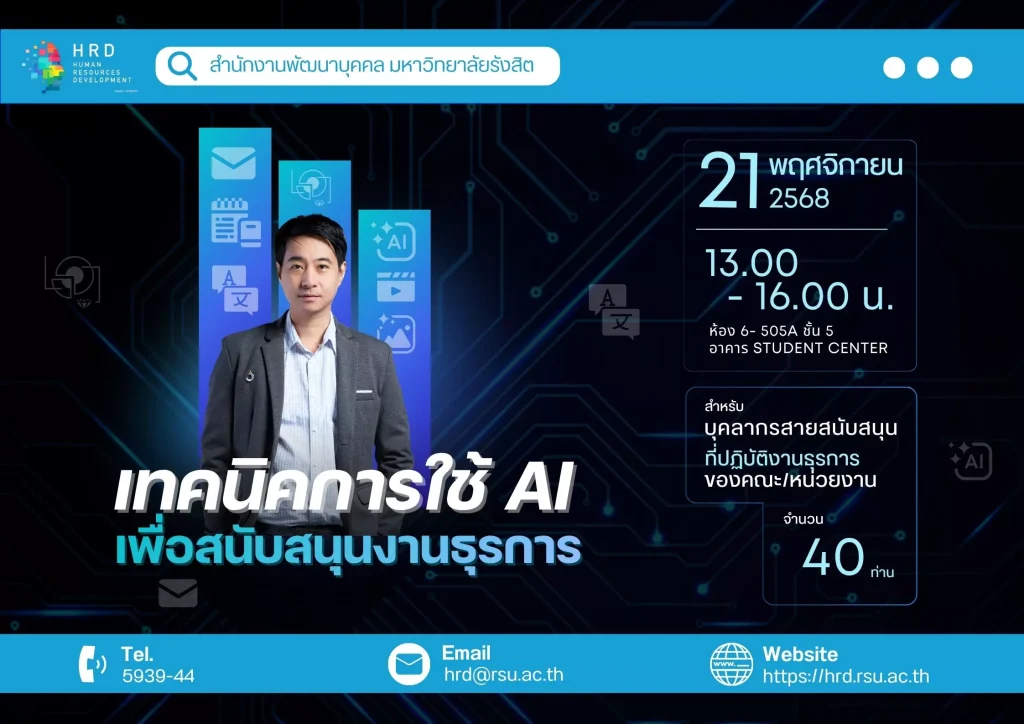 เทคนิคการใช้ AI เพื่อสนับสนุนงานธุรการ / ข่าวอบรม, อื่นๆ / By apear สำนักงานพัฒนาบุคคล ขอเชิญบุคลากรที่สนใจเข้าร่วมโครงการฝึกอบรม หลักสูตร “เทคนิคการใช้ AI เพื่อสนับสนุนงานธุรการ” วันศุกร์ที่ 21 พฤศจิกายน 2568 เวลา 13.00-16.00 น. ณ ห้องปฏิบัติการคอมพิวเตอร์ 6-505A ชั้น 5 อาคาร Student Center 21 พฤศจิกายน 68 เวลา 13.00-16.00 น. กลุ่มเป้าหมาย - บุคลากรสายสนับสนุน บุคลากรสายสนับสนุนที่ปฏิบัติงานธุรการจำนวน 40 ท่าน หมายเหตุ ขอสงวนสิทธิ์การสมัครเข้าอบรม หน่วยงานละ 1 ท่านเท่านั้น หน้าข่าวประชาสัมพันธ์ #อย่าหยุดยั้งการพัฒนาตัวเอง#HRDRSU