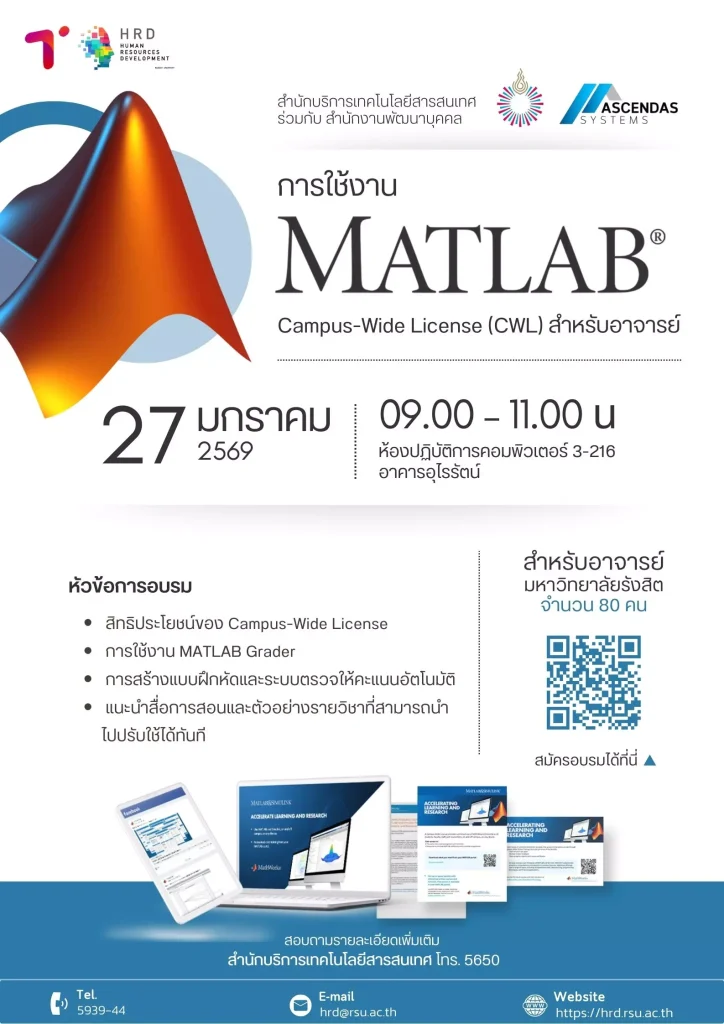 การใช้งาน MatLab / ข่าวอบรม, อื่นๆ / By apear สำนักบริการเทคโนโลยีสารสนเทศ ร่วมกับ สำนักงานพัฒนาบุคคล กำหนดจัดโครงการอบรม การใช้งาน MATLAB ในวันที่ 27 มกราคม 2569 เวลา 09.00-11.00 น. ห้อง 3-216 ชั้น 2 อาคารอุไรรัตน์ 27 มกราคม 69 : 09.00-11.00 น. หัวข้อการอบรม สิทธิประโยชน์ของ Campus-Wide Licenseการใช้งาน MATLAB Graderการสร้างแบบฝึกหัดและระบบตรวจให้คะแนนอัตโนมัติแนะนำสื่อการสอนและตัวอย่างรายวิชาที่สามารถนำไปปรับใช้ได้ทันที กลุ่มเป้าหมาย อาจารย์มหาวิทยาลัยรังสิต จำนวน 80 คน หน้าข่าวประชาสัมพันธ์ #อย่าหยุดยั้งการพัฒนาตัวเอง#HRDRSU