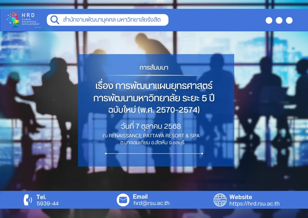 การจัดทำแผนมหาวิทยาลัยรังสิต / rsu, อื่นๆ / By apear แผนยุทธศาสตร์มหาวิทยาลัย มหาวิทยาลัยรังสิต กำหนดจัดงานสัมมนาผู้บริหารระดับสูง ในหัวข้อเรื่อง “การพัฒนาแผนยุทธศาสตร์การพัฒนามหาวิทยาลัย ระยะ 5 ปี ฉบับใหม่ (พ.ศ.2570-2574) ” ในวันที่ 6-7 ตุลาคม 2568 เวลา 09.00-16.00 น. ณ Ranaissance Pattaya Resort & Spa ต.นาจอมเทียน อ.สัตหีบ จ.ชลบุรี กลุ่มเป้าหมาย : คณะกรรมการสภามหาวิทยาลัย / รองอธิการบดี / ผูัช่วยอธิการบดี /อธิการ และ คณบดี หน้าข่าวประชาสัมพันธ์