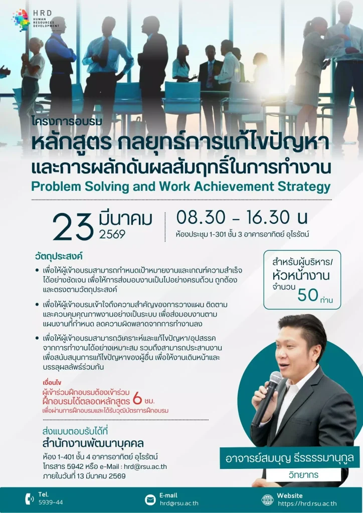 มหาวิทยาลัยรังสิต กำหนดจัดโครงการพัฒนาผู้บริหาร หลักสูตร “กลยุทธ์การแก้ไขปัญหาและการผลักดันผลสัมฤทธิ์ในการทำงาน  (Problem Solving and Work Achievement Strategy) ให้กับผู้บริหารคณะและหน่วยงาน   ในวันจันทร์ที่ 23 มีนาคม 2569 เวลา 08.30-16.30 น. ณ ห้อง 1-301 ชั้น 3 อาคารอาทิตย์ อุไรรัตน์  ได้รับเกียรติจาก อ.สมบุญ ธีรธรรมานุกูล เป็นวิทยากรบรรยาย