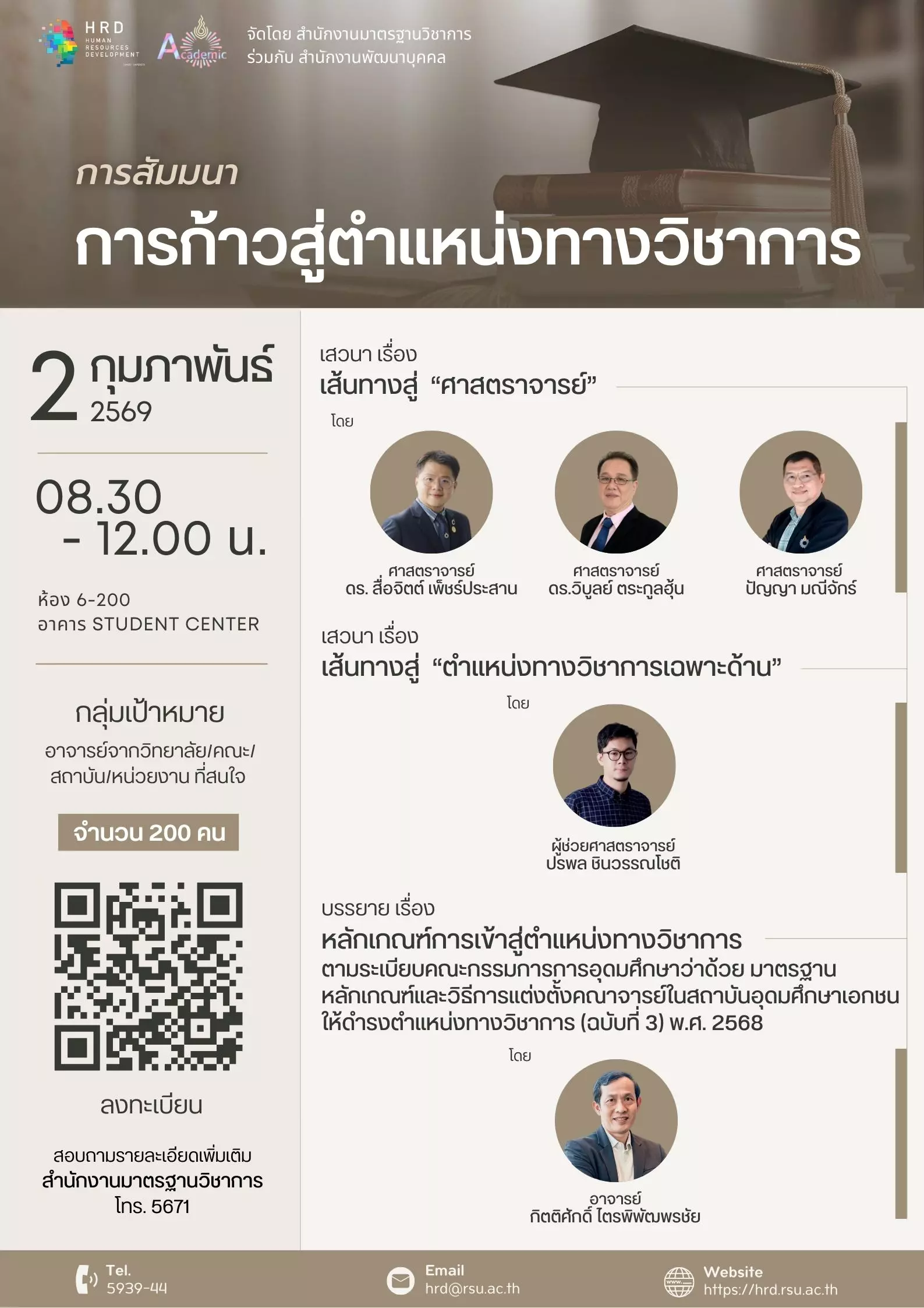 การก้าวสู่ตำแหน่งทางวิชาการ / ข่าวอบรม, อื่นๆ / By apear สำนักงานมาตรฐานวิชาการ ร่วมกับ สำนักงานพัฒนาบุคคล กำหนดจัดโครงการสัมมนา การก้าวสู่ตำแหน่งทางวิชาการ ในวันจันทร์ที่ 2 กุมภาพันธ์ 2569 เวลา 08.30-12.00 น. ณ ห้อง 6-200 ชั้น 2 อาคาร Student Center 2 กุมภาพันธ์ 69 : 08.30-12.00 น. กลุ่มเป้าหมาย อาจารย์มหาวิทยาลัยรังสิต จำนวน 200 คน สอบถามรายละเอียดเพิ่มเติมได้ที่ สำนักงานมาตรฐานวิชาการ โทร.5671 หน้าข่าวประชาสัมพันธ์ #อย่าหยุดยั้งการพัฒนาตัวเอง#HRDRSU