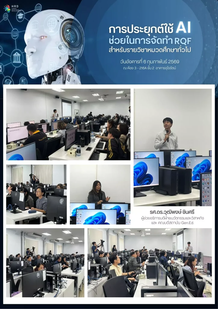 สำนักงานพัฒนาบุคคล ร่วมกับ สถาบัน Gen.Ed. จัดโครงการฝึกอบรม หลักสูตร “การประยุกต์ใช้ AI เพื่อช่วยในการจัดทำ RQF สำหรับรายวิชาศึกษาทั่วไป” ในวันศุกร์ที่ 6 กุมภาพันธ์ 2569 เวลา 13.00-16.00 น. ห้อง 3-216 อาคารอุไรรัตน์ โดย รศ.ดร.วุฒิพงศ์ ชินศรี ผู้ช่วยอธิการบดีฝ่ายนวัตกรรมและวิสาหกิจ และคณบดีสถาบัน Gen.Ed. ให้เกียรติเป็นวิทยากรบรรยาย มีผู้เข้าร่วมโครงการอบรมทั้งสิ้น จำนวน 29 คน