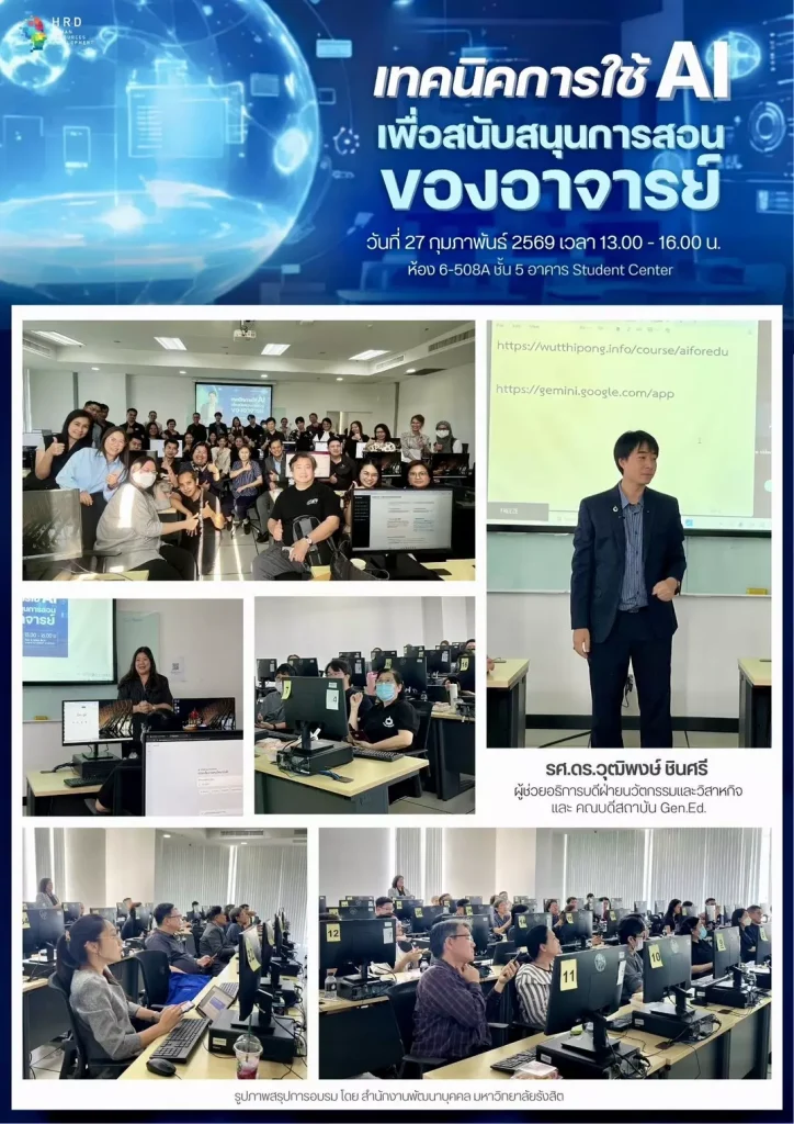 สำนักงานพัฒนาบุคคล จัดโครงการฝึกอบรม หลักสูตร “เทคนิคการใช้ AI เพื่อสนับสนุนการสอนของอาจารย์” รุ่นที่ 1 ในวันศุกร์ที่ 27 กุมภาพันธ์ 2569 เวลา 13.00-16.00 น. ห้อง 6-508 A อาคาร Student Center โดย รศ.ดร.วุฒิพงศ์ ชินศรี ผู้ช่วยอธิการบดีฝ่ายนวัตกรรมและวิสาหกิจ และคณบดีสถาบัน Gen.Ed. ให้เกียรติเป็นวิทยากรบรรยาย มีผู้เข้าร่วมโครงการอบรมทั้งสิ้น จำนวน 37 คน