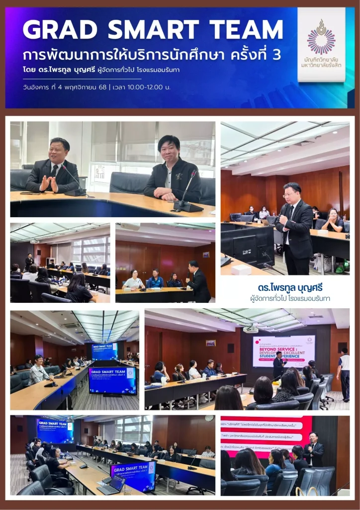 บัณฑิตวิทยาลัย จัดโครงการฝึกอบรม หลักสูตร “Grad Smart Team : การพัฒนาการให้บริการนักศึกษา” ในวันอังคารที่ 4 พฤศจิกายน 2568 เวลา 10.00-12.00 น. ณ ห้อง 1-308 ชั้น 3 อาคารอาทิตย์ อุไรรัตน์ โดยได้รับเกียรติจากวิทยากรผู้ทรงคุณวุฒิ ดร.ไพรทูล บุญศรี ผู้จัดการทั่วไป โรงแรมอมรันทา เป็นวิทยากรการบรรยาย มีผู้เข้าร่วมโครงการ ทั้งสิ้น 48 คน