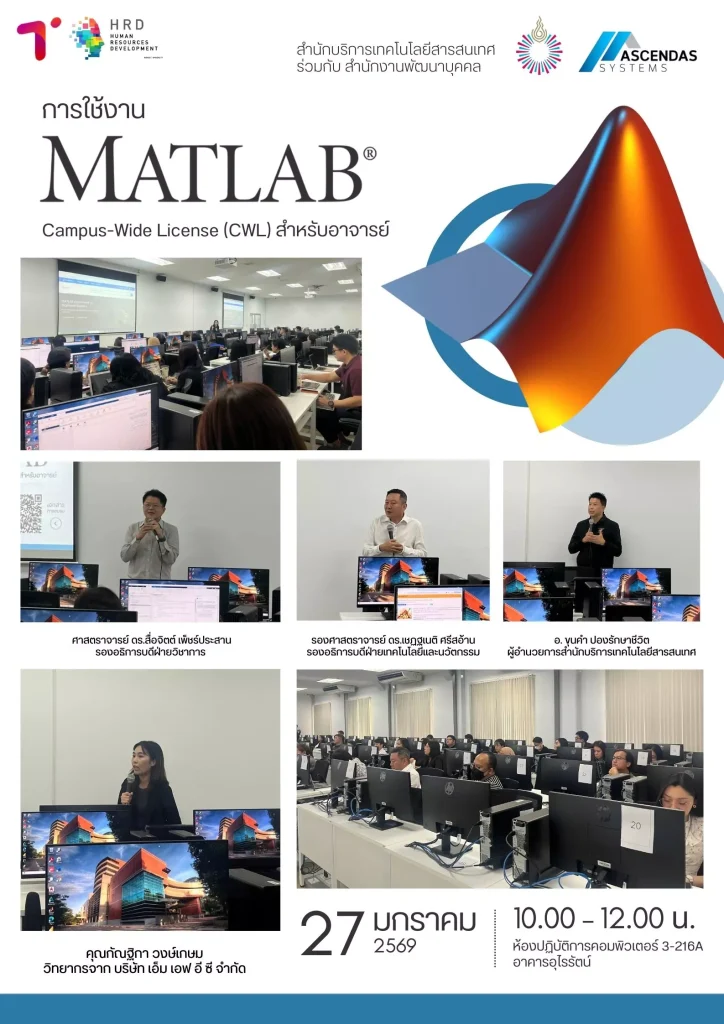 สำนักบริการเทคโนโลยีสารสนเทศ ร่วมกับ สำนักงานพัฒนาบุคคล จัดโครงการฝึกอบรม หลักสูตร“การใช้งาน MATLAB ภายใต้ Campus-Wide License” ในวันที่ 27 มกราคม 2569 เวลา 10.00-12.00 น. ณ ห้อง 3-216A อาคารอุไรรัตน์ โดย คุณกัณฐิกา วงษ์เกษม วิทยากรจาก บริษัท เอ็ม เอฟ อี ซี จำกัด เป็นวิทยากรการบรรยาย มีอาจารย์ผู้สนใจเข้าร่วมการอบรมทั้งสิ้น จำนวน 39 คน