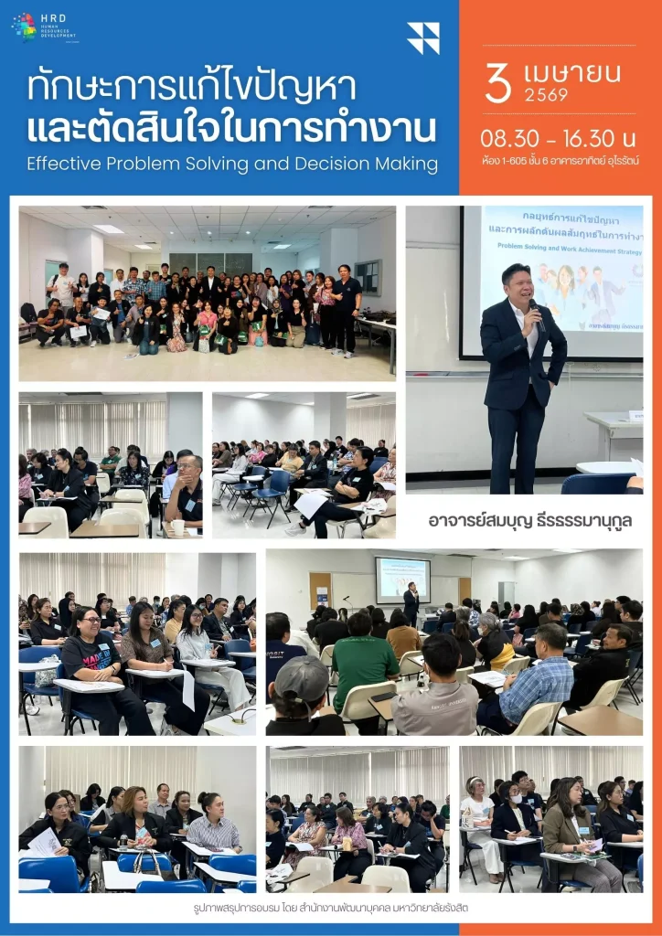 สำนักงานพัฒนาบุคคล จัดโครงการฝึกอบรม หลักสูตร ทักษะการแก้ไขปัญหา และการตัดสินใจในการทำงาน ในวันศุกร์ที่ 3 เมษายน 2569 เวลา 08.30-16.30 น. ณ ห้องประชุม 1-605 ชั้น 6 อาคารอาทิตย์ อุไรรัตน์ ได้รับเกียรติจาก อ.สมบุญ ธีรธรรมานุกูล เป็นวิทยากรบรรยาย มีบุคลากรเข้าร่วมการอบรมทั้งสิ้น จำนวน 52 คน