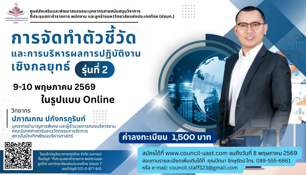 อบรมภายนอก-การจัดทำตัวชี้วัดและการบริหารผลการปฏิบัติงาน รุ่นที่ 2 / อบรมภายนอก / By apear อบรมภายนอก มีค่าใช้จ่าย ศูนย์ส่งเสริมและพัฒนาสมรรถนะบุคลากรสายสนับสนุนวิชาการ ที่ประชุมสภาข้าราชการพนักงาน และลูกจ้างมหาวิทยาลัยแห่งประเทศไทย (ปขมท.) ได้กำหนดจัดอบรม หลักสูตร การจัดทำตัวชี้วัดและการบริหารผลการปฏิบัติงาน รุ่นที่ 2 ระหว่างวันที่ 9-10 พฤษภาคม 2569 ผ่านระบบ Online หลักสูตร การจัดทำตัวชี้วัดและการบริหารผลการปฏิบัติงาน รุ่นที่ 2 วันที่ 9-10 พฤษภาคม 2569ผ่านระบบ Online รายละเอียดเพิ่มเติม สมัครได้ที่นี่ สมัครได้ที่ www.council-uast.com ภายในวันที่ 8 พฤษภาคม 2569สอบถามรายละเอียดเพิ่มเติมได้ที่ 089-555-666-1 หรือ email : council.staff123@gmail.com หน้าข่าวประชาสัมพันธ์ #อย่าหยุดยั้งการพัฒนาตนเอง#HRDRSU